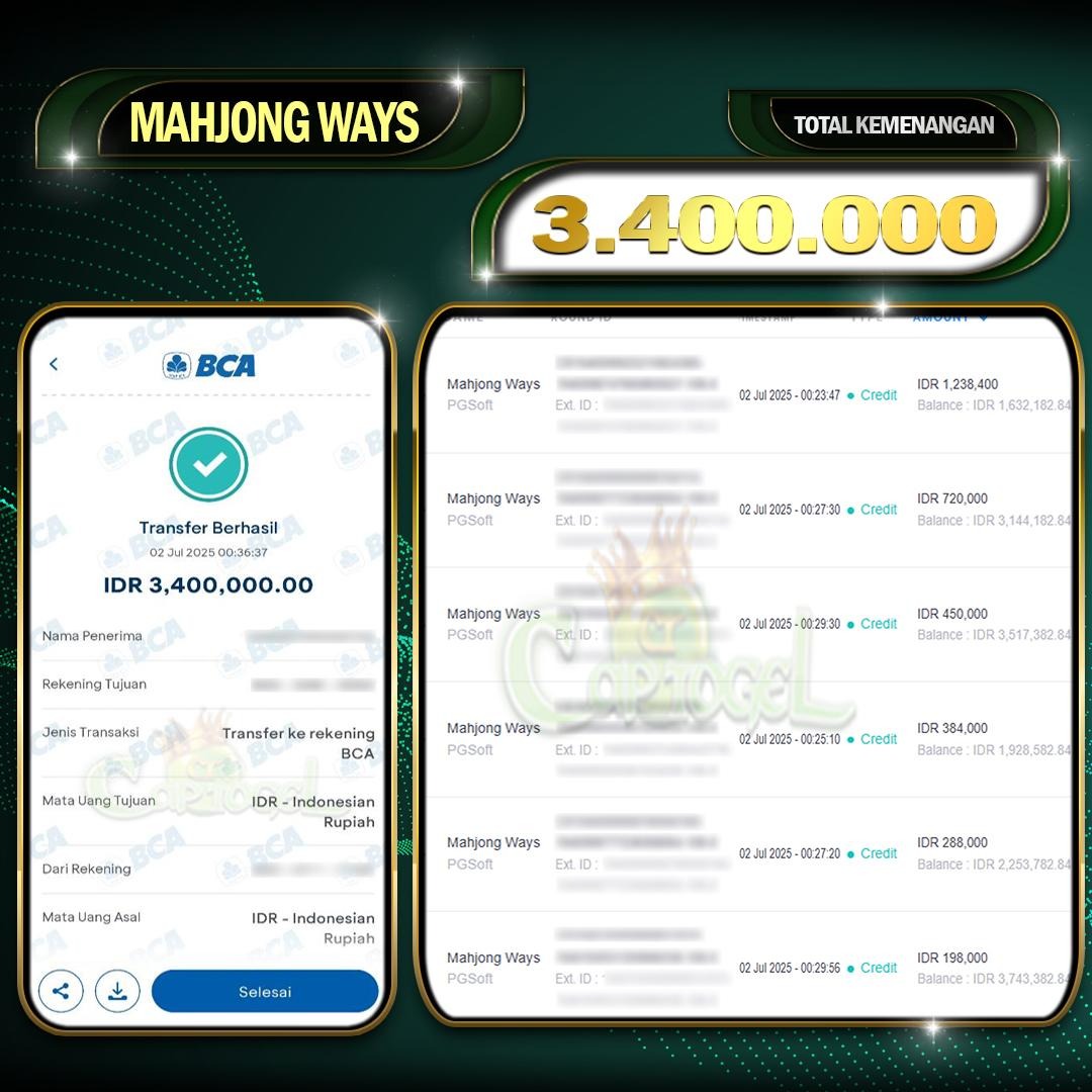 Kami juga merayakan kemenangan besar salah satu pemain setia CAPTOGEL, yang berhasil meraih kemenangan sebesar Rp 3.000.000 dalam permainan MAHJONG WAYS pada tanggal 02 JULY 2025. Kemenangan ini telah diproses dan dibayar lunas ke rekening yang terdaftar. Semoga kemenangan ini dapat menjadi motivasi bagi pemain lainnya untuk terus mencoba keberuntungan mereka dan menikmati pengalaman bermain yang menyenangkan di CAPTOGEL.